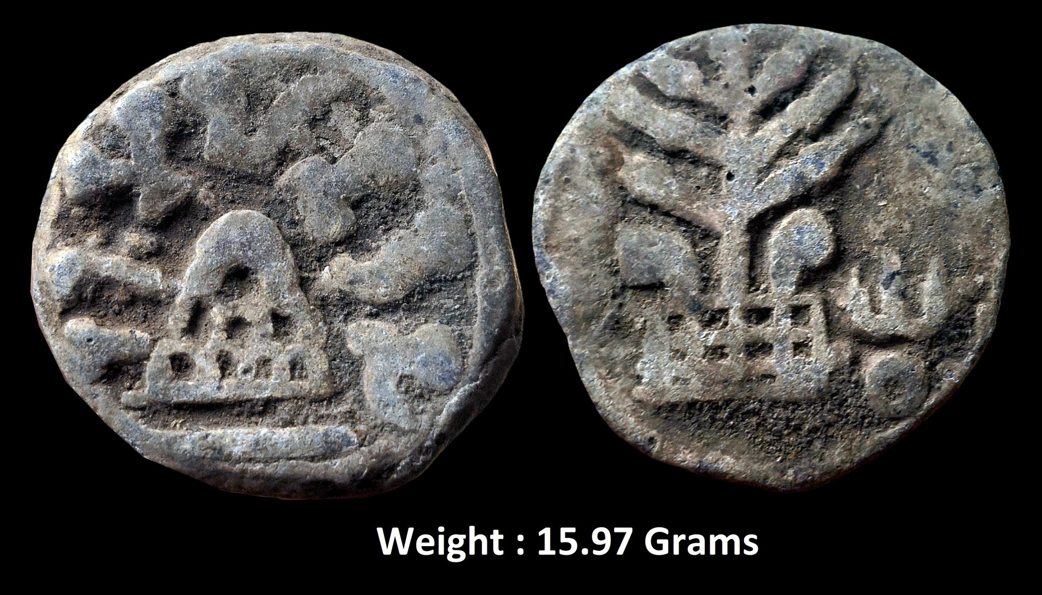 Ancient ; Anandas of Karwar ; Mulanand ; Lead Unit ; Obv: eight arched hill, river below, brahmi legend “rajno/mulanamdasa” ; Rev: tree railing to left nandipada ; 15.97 Grams (Mitch, K&A # 34),