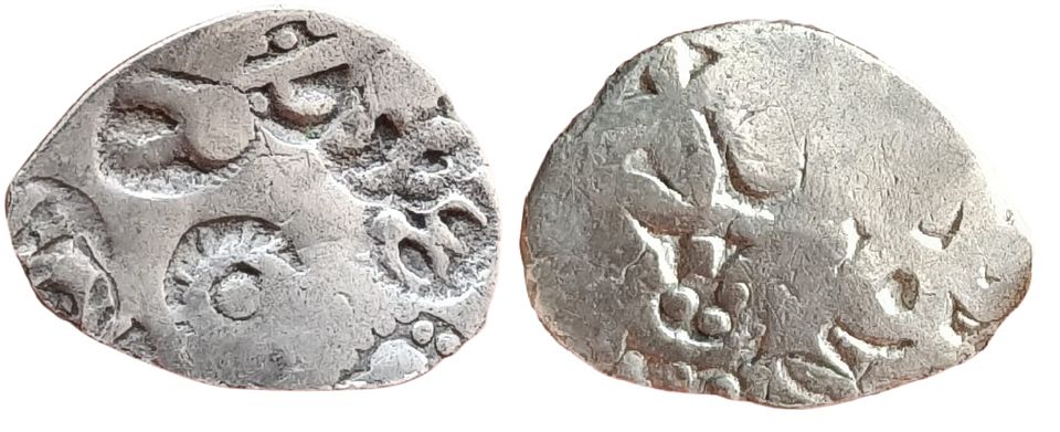 Ancient ; Archaic Punch Marked Coinage, Kashi Janapada under Kosala Janapada (c. 525-465 BC), Silver ? Vimshatika, 2.68, four different geometric symbols. A Rare denomination. “SAVE HERITAGE SAVE COINS”