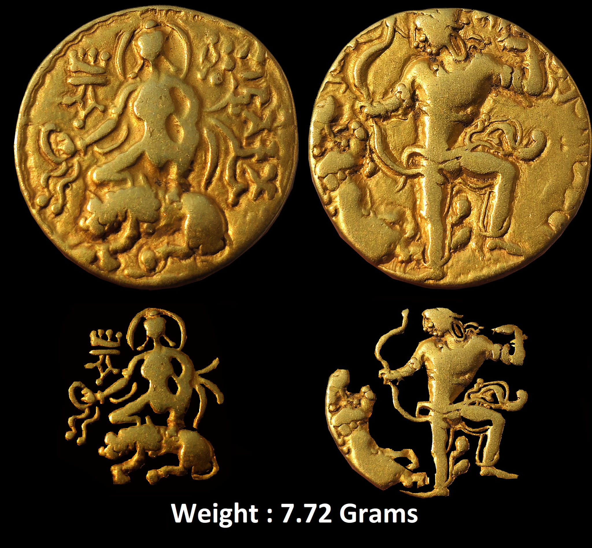 Obv: the king, nimbate, is seen mid-hunt, wearing a dhoti, a cap with a pearl string behind, a necklace and in armour, the king is seen holding bow in the right hand with the left having released the bow string and slaying the Lion and the Lion is seen falling backwards with an arrow in its mouth facing the king, circular Brahmi legend “Narandrachandrah Pra(thitarano rane jayatyajayyo bhuvi Sinha)vikramah?,