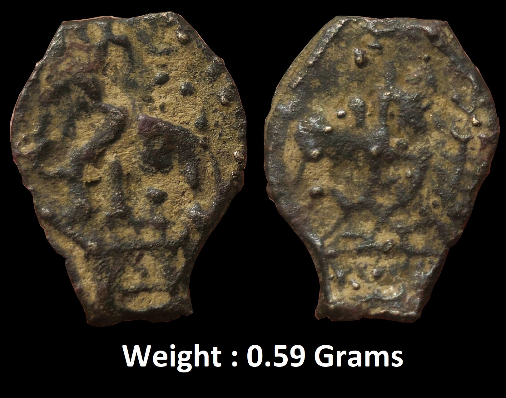 Ancient ; Kaushambi/Vatsa Region (200 BC), Cast Copper Unit, Obv: Elephant standing facing left, an Ujjaini symbol above, Rev: a Bull to right on six-arched hill, a railed tree on the right field, 0.59g, 12.56mm, Very fine, Very Rare.