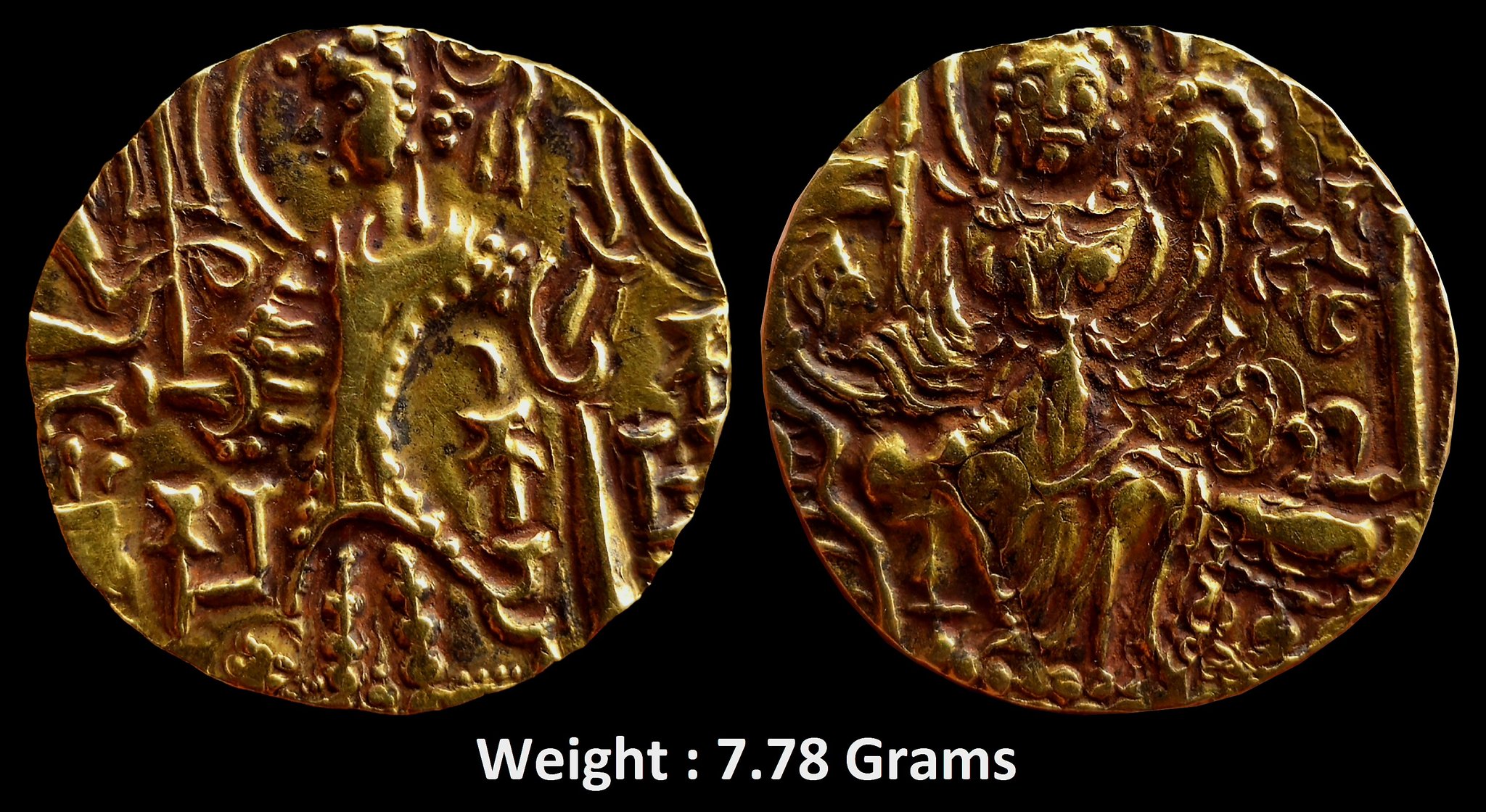 Ancient ; Kushan Dynasty ; Shaka I (325-345 AD) ; Gold Dinar, Obv: king standilng left holding a trident in right hand, making an offering at an altar with his left hand, garlanded trident above alter, brahmi initials,’Vi ‘near legs and sita below the hand, Rev: ardoksho enthroned facing, holding cornucopia, tamgha in upper left field, bactrian legend at right “APAOXþO” ; Weight : 7.78 Grams ; About extremely fine ; Rare