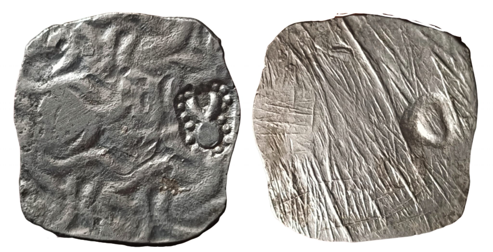Ancient : Punch Marked Coin ; Panchala Janapada (400-350 BC), Silver Vimshatika, Obv: four punches consisting of three composite ?S? shaped geometrical designs, counterstruck with a beaded taurine,