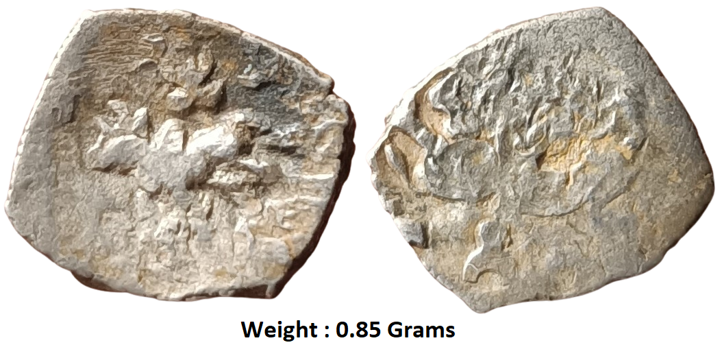 Ancient ; Punch Marked Coins ; Saurashtra Janapada ; Silver 1/4 Karshapana ; re-struck on another coin which clearly shows the impressions and symbols of legs of horse, trunk of elephant, Obv: bull facing left, Rev: geometric symbols,about very fine, very unusual to find, Rare.