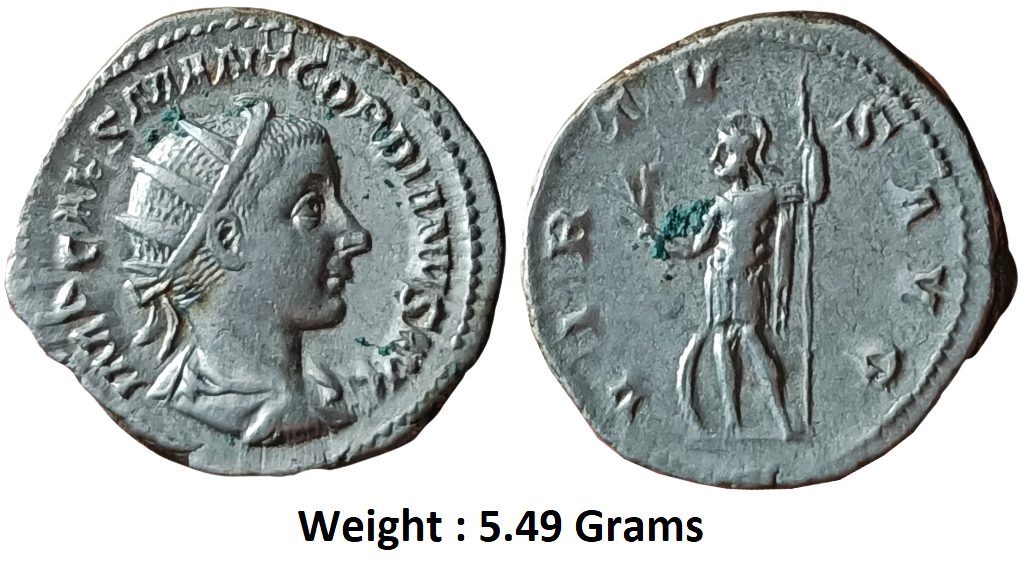 Note : Gordian III became the youngest sole Roman emperor at the age of 13 after the death of Emperor Severus Alexander. The last of the 6 Emperors in the tumultuous Year of the 6 emperors – the year 238AD in which 6 people had been Roman Emperor. His reign was not long. He died at the age of 19, possibly at Zaitha at the hands of his army, or in battle against the Sassanids. “SAVE HERITAGE SAVE COINS”