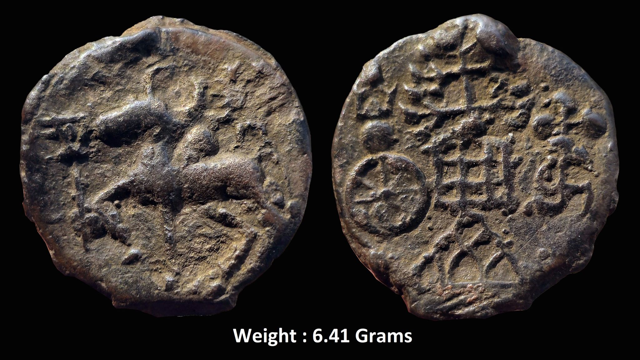 Obv: ‘Lanky bull’ walking to left; triangle-headed standard in front, Nandyavarta symbol above. Rev: Tree-in-railing in centre; Nandipada and wheel to left, ‘Ujjain’ symbol and Swastika to right; six-arched hill below.