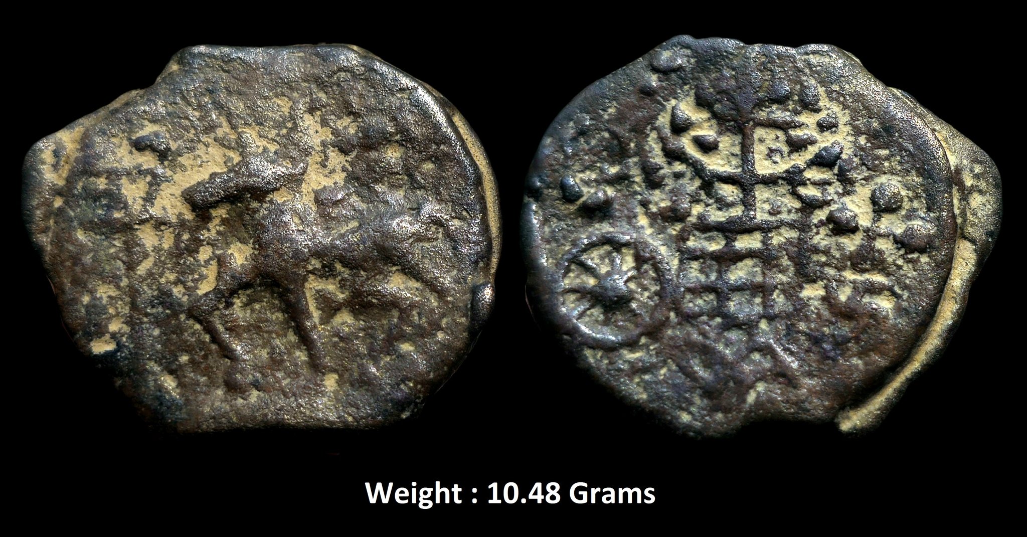 Obv: ‘Lanky bull’ walking to left; triangle-headed standard in front, Nandyavarta symbol above. Rev: Tree-in-railing in centre; Nandipada and wheel to left, ‘Ujjain’ symbol and Swastika to right; six-arched hill below.