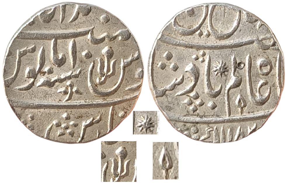 INO Shah Alam II, Trident (trishul) as mint mark within the Seen of Julus, AH 1183/11 (similar to Kapoor & Master 3.79, KM 36.5) “SAVE HERITAGE SAVE COINS”
