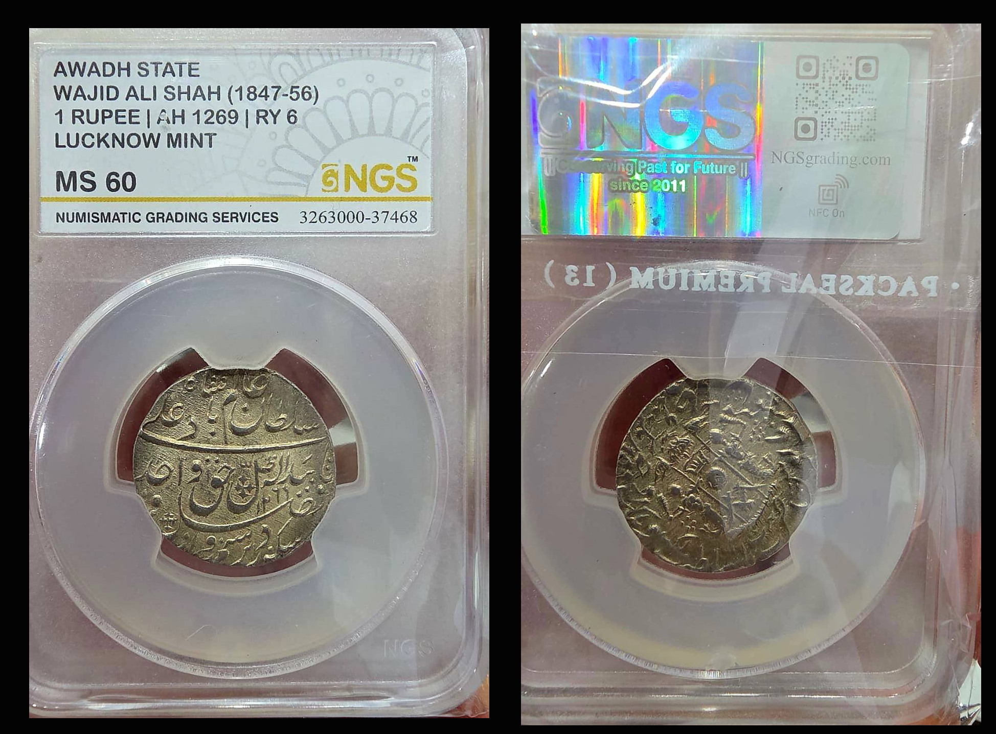 Awadh State ; Wajid Ali Shah ; MS 60 Graded Rare Silver Rupee ; Mint : Daral Saltanat Lakhnau Mulk Awadh Akhtarnagar ; 1269 AH / RY 6