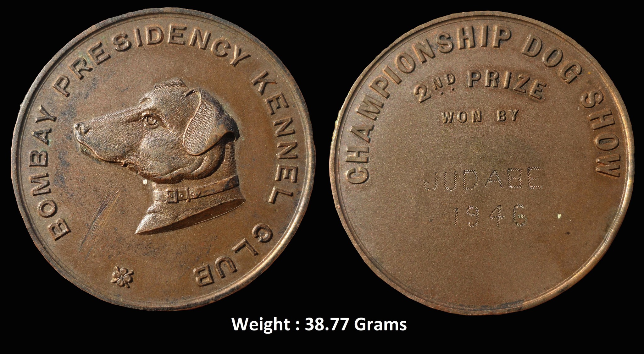 Bombay Presidency ; Kennel Club ; Very Rare Medal ; Championship Dog Show ; 2nd Prize Won by ” Judabe ” ; 1946 ; Weight : 38.77 Grams ; 45 mm ;