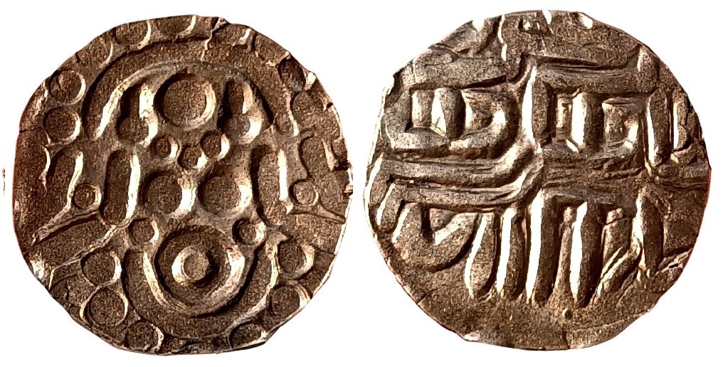 Hindu Coins of Medieval India ; Chandellas of Jejakabhukti; Paramardi Varman (1165-1203 AD); Debase Gold 4-1/2 Masha; Obv: goddess lakshmi seated facing, Rev: devanagari legend in three lines “Srimat/Paramardi”,