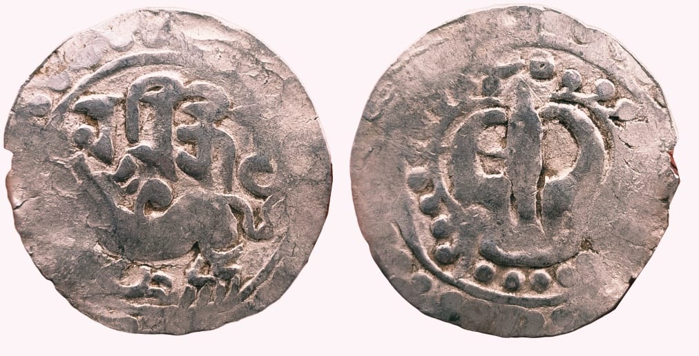 Rev: tripartite symbol with long central shaft crescent on left and sun on right, 5.93g, (S.K.Bose # HD 1.3), “SAVE HERITAGE SAVE COINS”