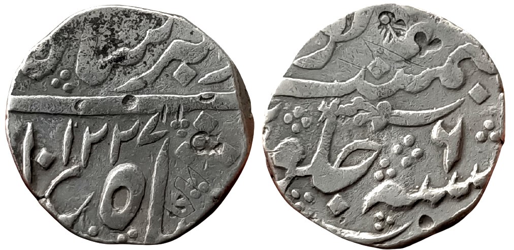 Mint : Khujista Bunyad (Aurangabad) , in the name of Muhammad Akbar II, AH 1227/6, sword as mint mark above Sanah, Unpublished. Very Rare. “SAVE HERITAGE SAVE COINS”