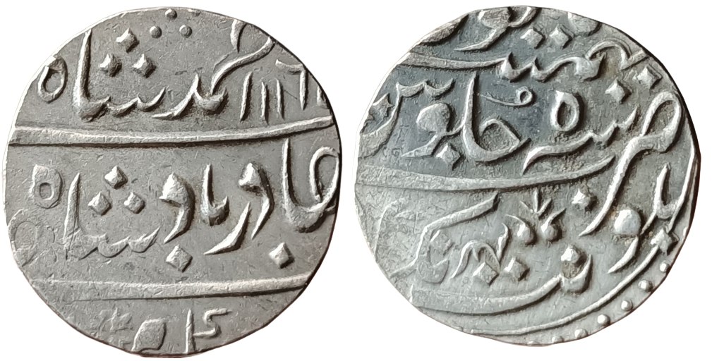 HomeINDEPENDENT KINGDOMSMARATHA CONFIDERACY Independent Kingdom ; Maratha Confideracy ; INO Ahmed Shah Bahadur ; Silver Rupee ; 116[] AH / RY 5 Mint : Balwantnagar (Jhansi) ;