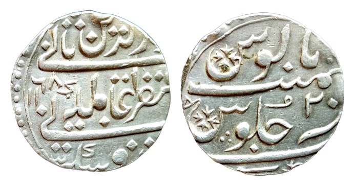 Independent Kingdom ; Maratha Confideracy ; INO Alamgir II ( Full Emperor Name ) ; High Grade Silver Rupee Mint : Balwantnagar (Jhansi) ; 1168 AH RY 2