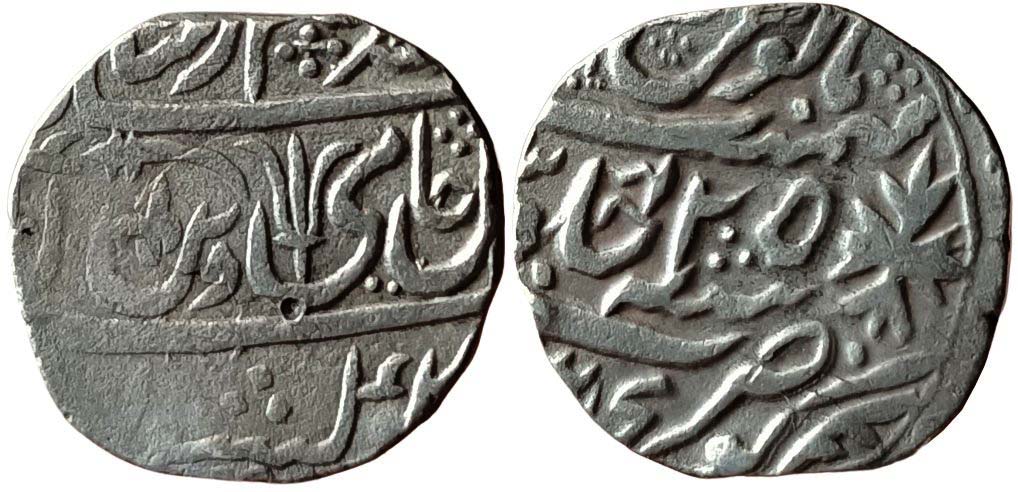 Obv: “saya-e-fazle-elah” couplet, sikka zad bar haft kishwar sayaye fazle elah, hami-e-dine mohammad, shah alam badshah, scimitar and trident mint mark,