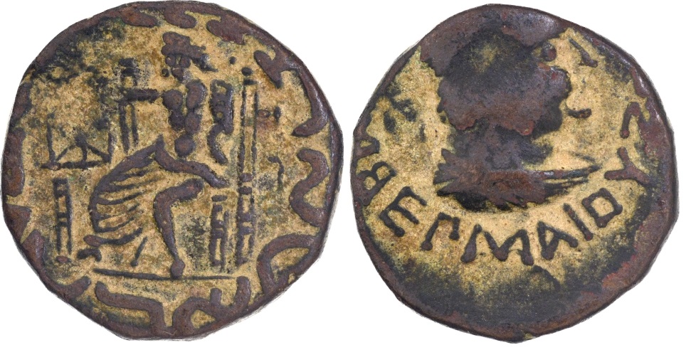 Indo Greeks, Hermaios (90-70 BC), **Copper Tetradrachma (Imitation), Obv: ***a diademed bust of the king, facing right, Greek legend **”BA?I?E?? ??THPO? EPMAIOY” *”Basileos Soteros Hermaiou” (….of King Hermaios, the Saviour) around the field, Rev: Zeus enthroned three-quarters left, holding sceptre in left hand, and bestowing blessing with right hand, the Kharoshthi legend “Maharajasa tratarasa / heramayasa” around the field, 8.85g, 22.07mm, (MIG # 421a), about very fine. “SAVE HERITAGE SAVE COINS”