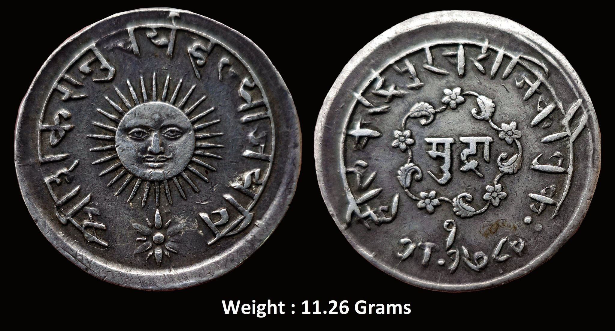 Rev: denomination “Mudra” within an ornate scroll, encircled by Devanagari legend “Holkarendra Puravaraji Kautuka Saka 1780” ; (KM # 15), Original patina, Centrally struck, UNC, Extremely Rare Specimen