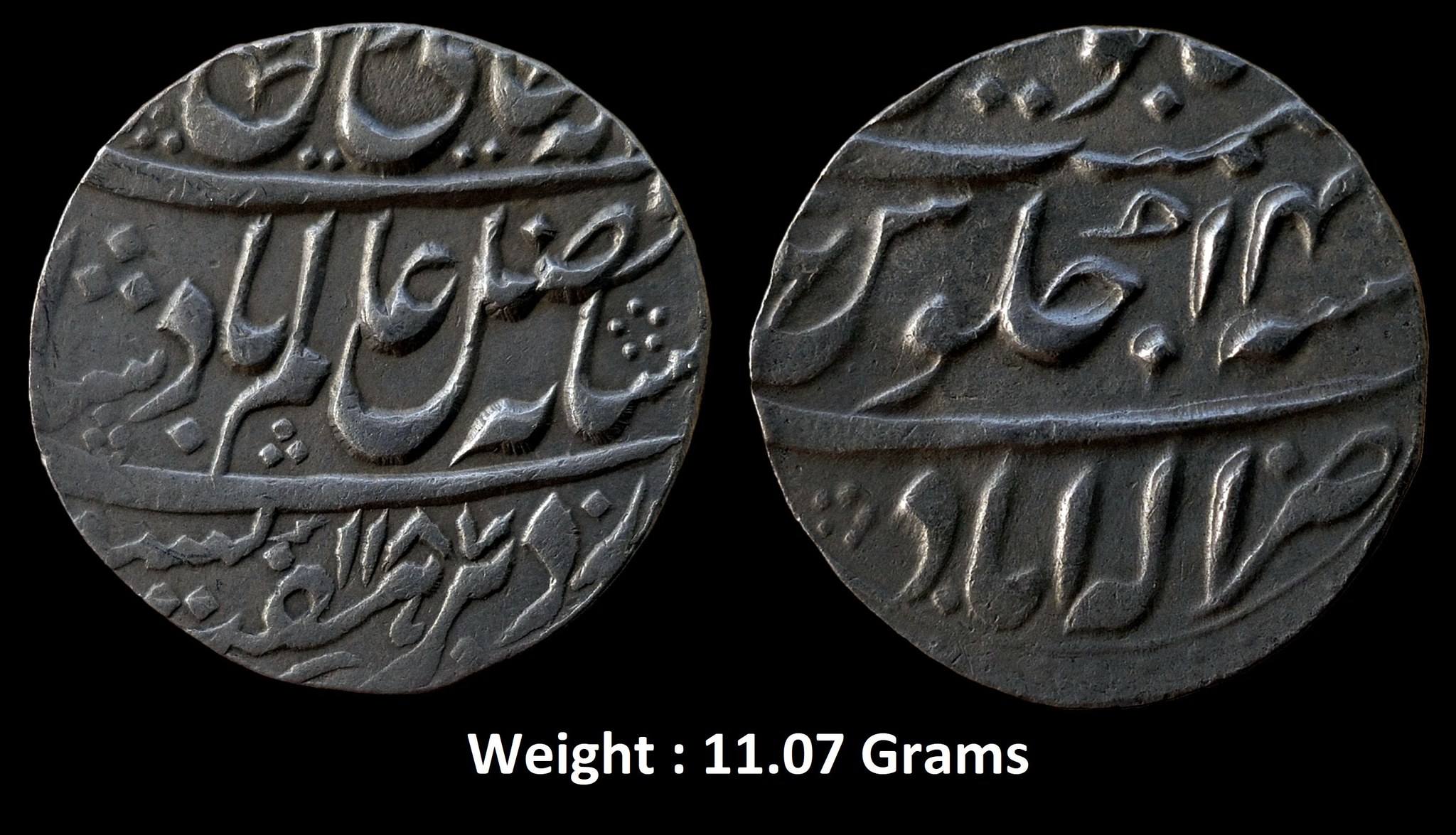 IPS ; Awadh State ; Shuja-ud-Daula (AH1167-1188) ; Mint : Allahabad ( FULL Mint ) ; Silver Rupee ; AH 1187/14 RY, ‘Saya-e-fazle elah’ Couplet, In the name of Shah Alam II ; Obv: sikka zad bar haft kishwar saya e fazle elah, hamie din-e- Muhammad, Shah Alam Badshah & hijri date 1187 ; Rev : sana 14 julus, zarb Allahabad at the bottom & Persian letter ‘Ain’ in the letter ‘seen’ of julus, (Master & Kapoor # 3.03), choice very fine ; Very Rare ; Weight : 11.07 Grams