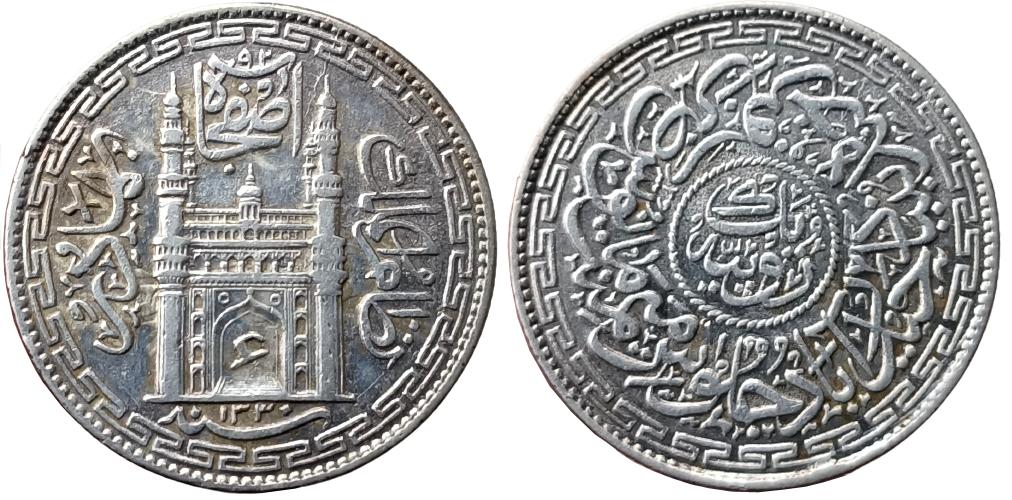 IPS ; Hyderabad State ; Mir Usman Ali ; High Grade Silver Rupee AH 1330 ; Half ‘Ain’ in doorway of Charminar ;