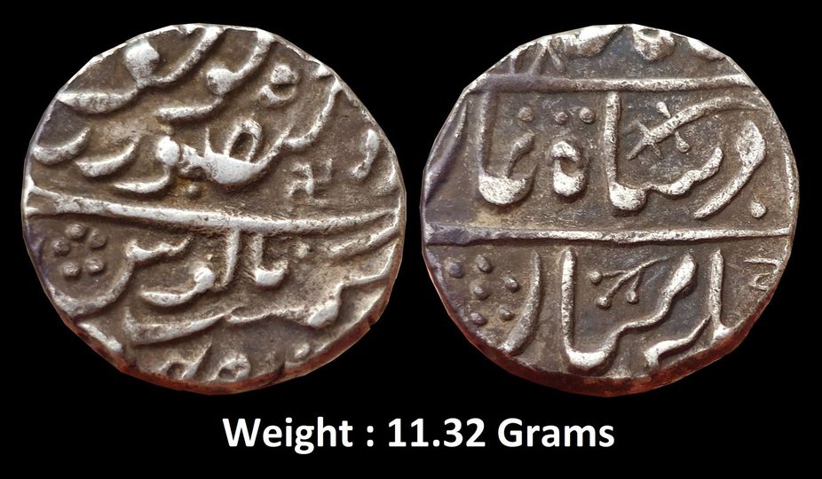 Princely States – Jodhpur Takhat Singh (AH 1259-1290, 1843-1873 AD), Silver Rupee,Weight : 11.22 Grams Mint : Pali with pseudo mint name Dar al-Mansur Jodhpur, INO Shah Alam II, sword on obv. (KM 18).