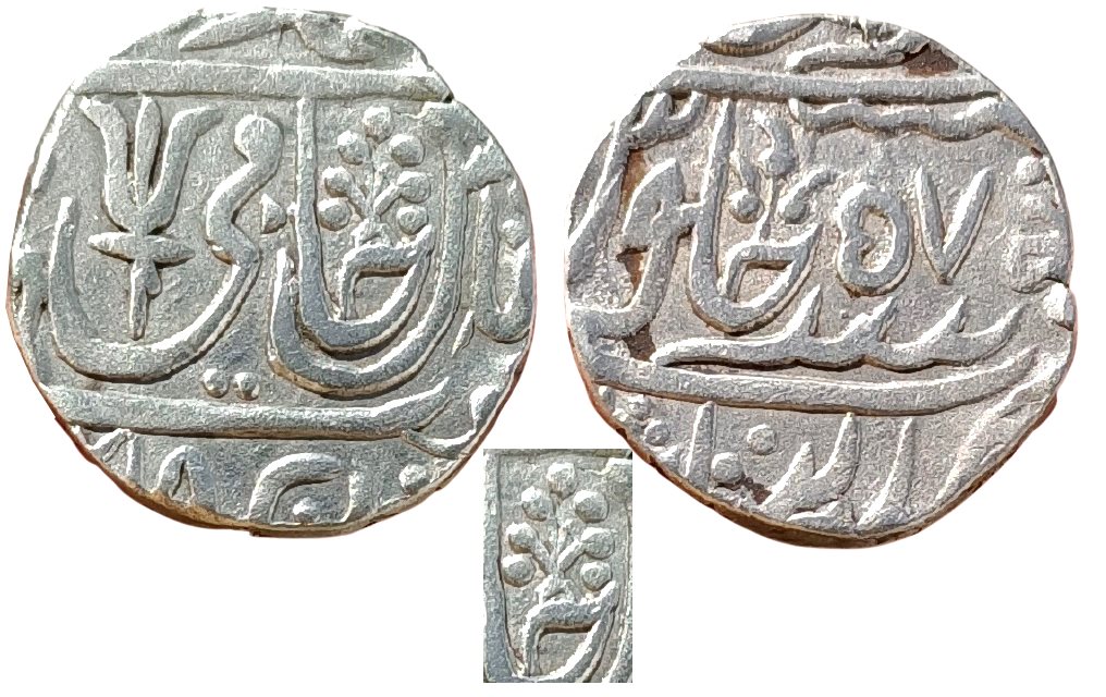 Mint : Jalaun, RY 57, Peacock head and trident mint mark, ?Haft Kishwar couplet? Obverse on the coin reads.?sikka zad bar haft kishwar saya-yi fazl hami-yi din-i ilah muhammad shah alam badshah?