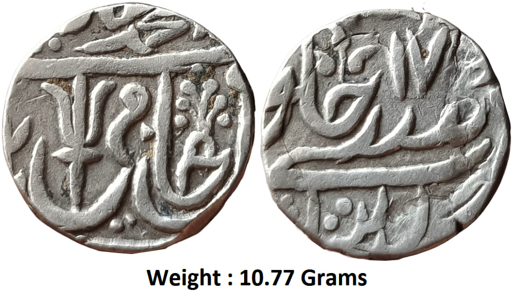 Peacock head and trident mint mark, ?Haft Kishwar couplet? Obverse on the coin reads.?sikka zad bar haft kishwar saya-yi fazl hami-yi din-i ilah muhammad shah alam badshah?
