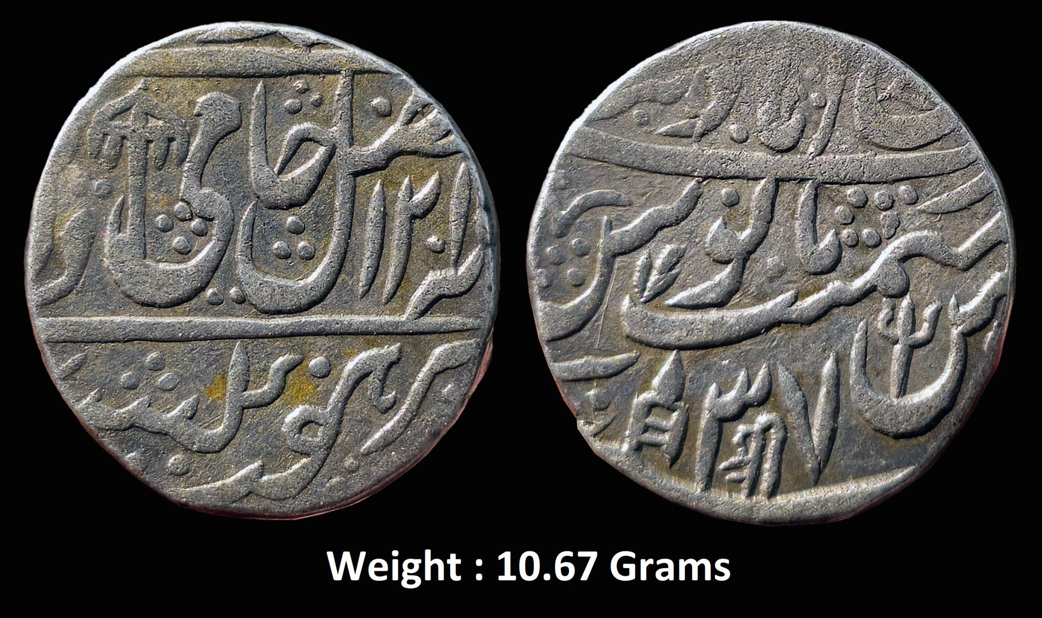 Maratha Confederacy ; Mominabad (Bindraban) Mint at top on reverse ; Silver Rupee ; INO Shah Alam II, Umbrella on obv ; a trident within the Seen of Julus , a sword , dagger and devnagri ” Shri ” on rev. (KM 10.1) ; 1201 AH / RY 37 ; Extremely Fine ; Very Rare ; Weight : 10.67 Grams