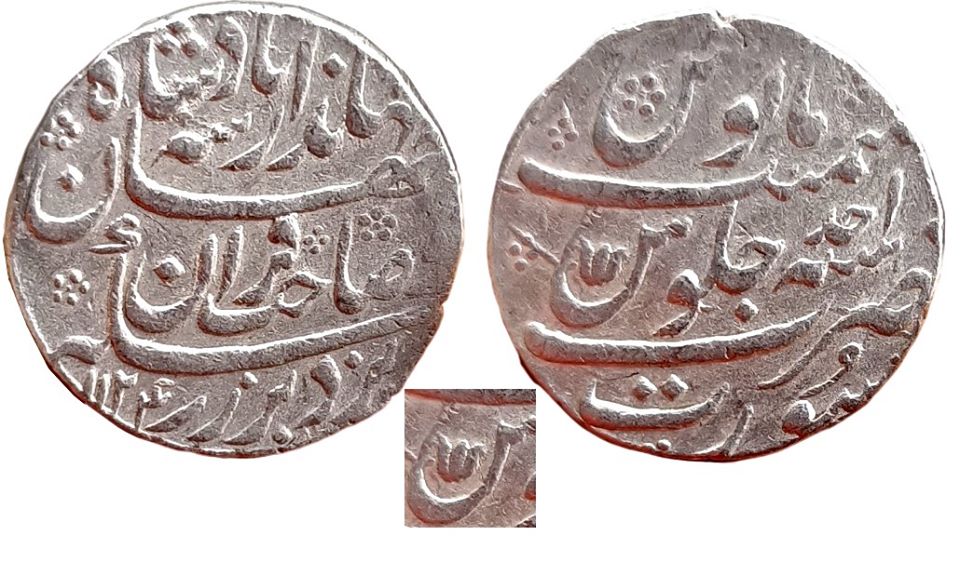 Note : A small Trishul-like mint mark in the Persian letter ” Seen ” of word ” Julus ” (KM 364.19).