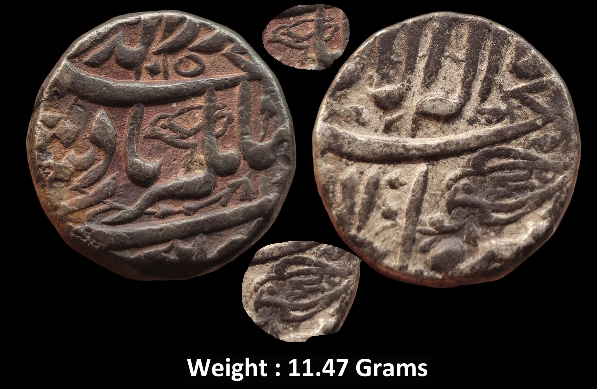 The birds on both sides of this coin are locked in ‘hunt’ in terms of design context. The falcon on the obverse swoops, with his wings close to his body to prey on the quail, shown cowering among the letters on the reverse. The spread-out talons of the falcon, ready to grasp the quail, are very clearly shown under his belly. The design might have had a connotation with Mughal campaigns against the Nizam Shahi Sultanate.