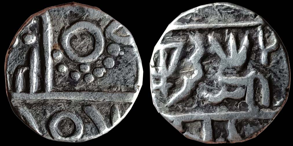 Gwalior State ; Mahadji Rao Silver Rupee , Dar ul Fath Ujjain Mint, INO Shah Alam II, sword as mint mark (KM 218 ). 1194 AH / RY 21