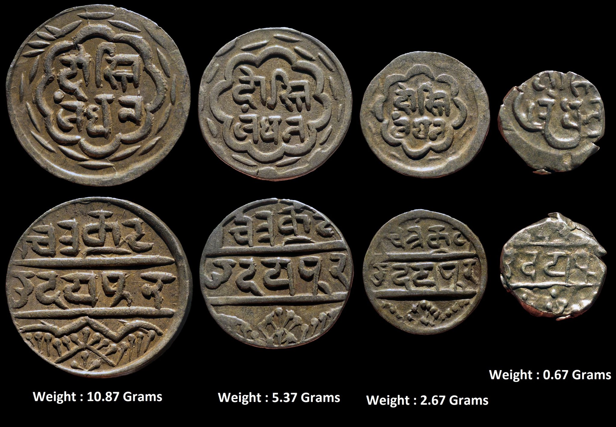 Dosti Landhan Issues, set of 4, Silver Rupee, ½, ¼, and 1/16, Udaipur Mint, no date, issue of VS 1858-1920, hammered coinage (KM 11, 10, 9, 8 & 7.1).
