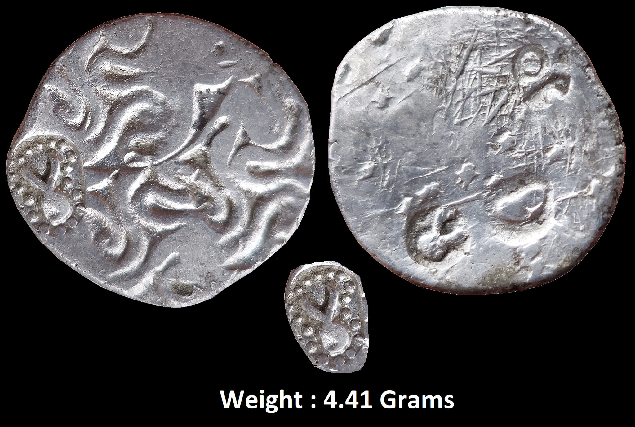 Punch Marked Coin ; Panchala Janapada (400-350 BC), Silver Vimshatika, Obv: four punches consisting of three composite ?S? shaped geometrical designs, counterstruck with a beaded taurine, Rev: two banker’s marks including taurines, 4.41g, 22.36mm, (Unlisted in Rajgors/Hardekar 2019 # WH 12), choice very fine, Rare.