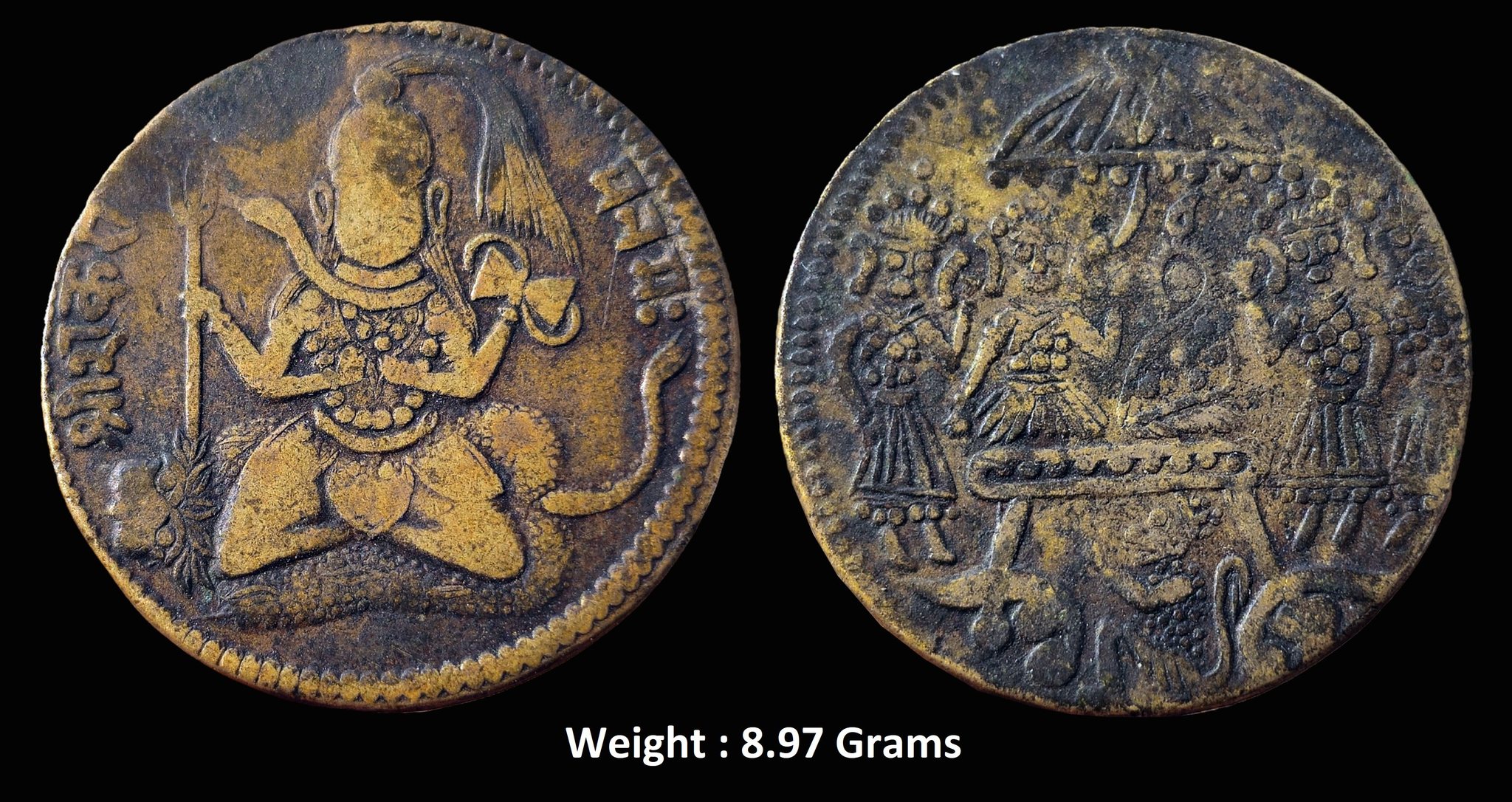 Temple Token ; North India Region ; Brass ; Obv: lord shiva seated ; Rev: lord rama’s darbar with sita, lakshmana, bharata , shatrugana, and hanuman sitting by the feet of lord rama ; Weight : 8.97 Grams ;