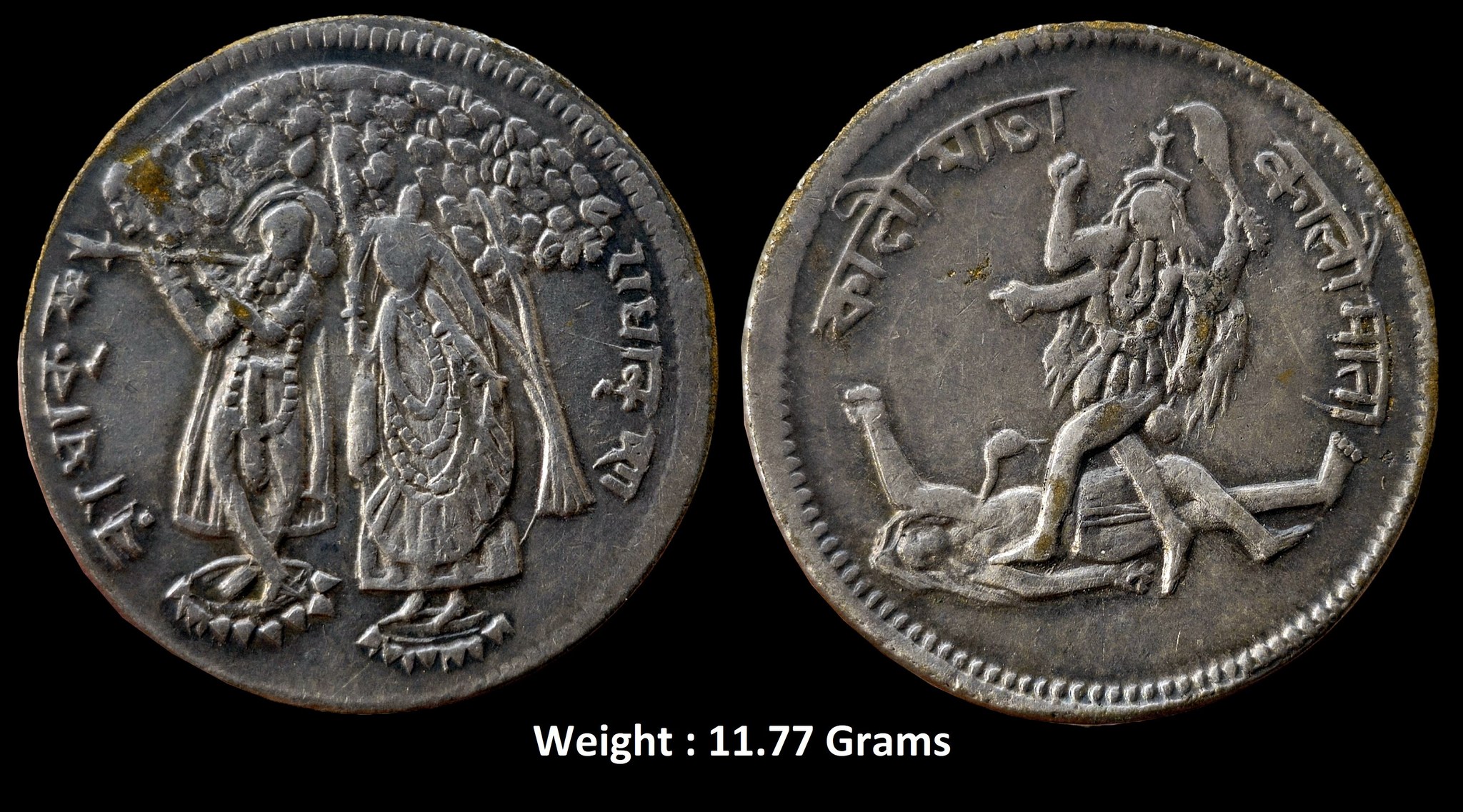 Obv : Radha Krishna standing under tree playing basuri with ” Radha Krishna ” written in both bangla and devnagri ; Rev : Godess Kali in rudra Avtaar with ” Kali Mata ” written in both bangla and devnagri ;